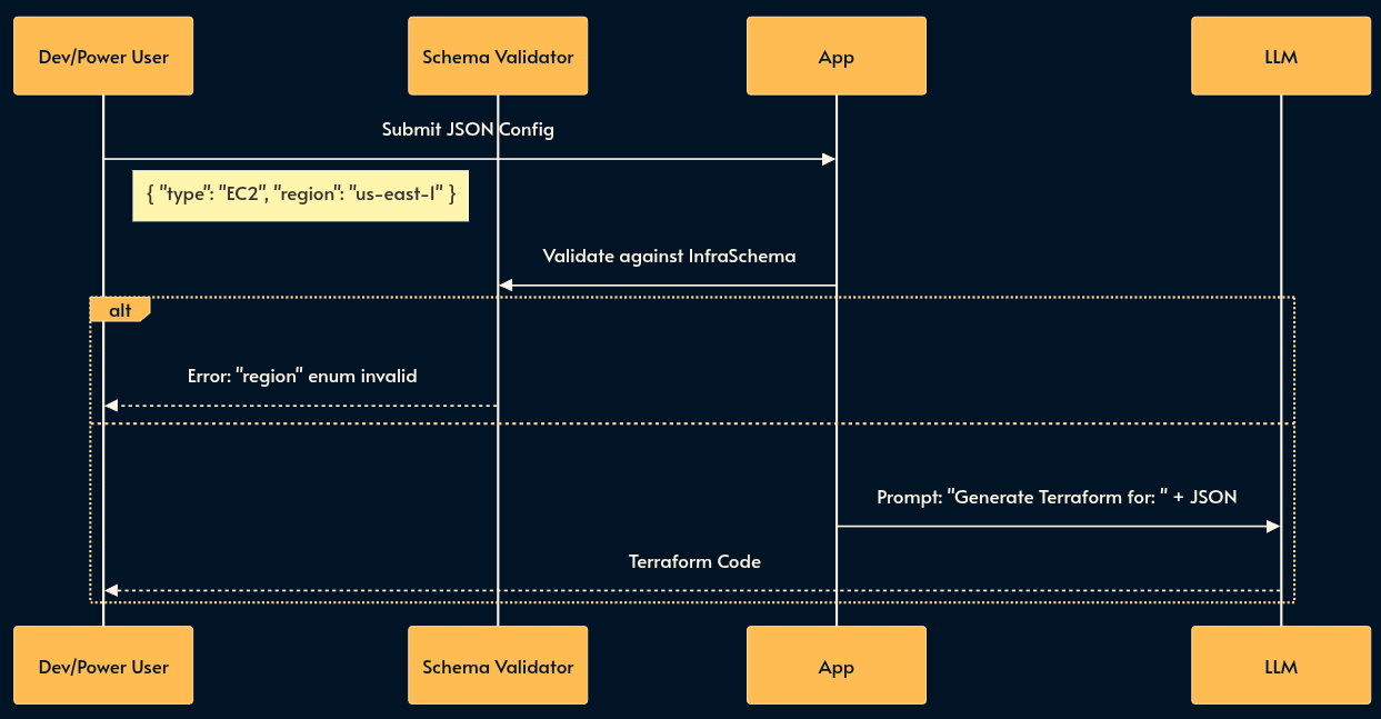Instead of writing a paragraph describing a cloud infrastructure, the user submits a JSON config. The system validates this against a schema (e.g., JSON Schema/Zod) before it ever reaches the LLM. This shifts the “prompting” mental model from “Writing Prose” to “Writing Configuration.”
