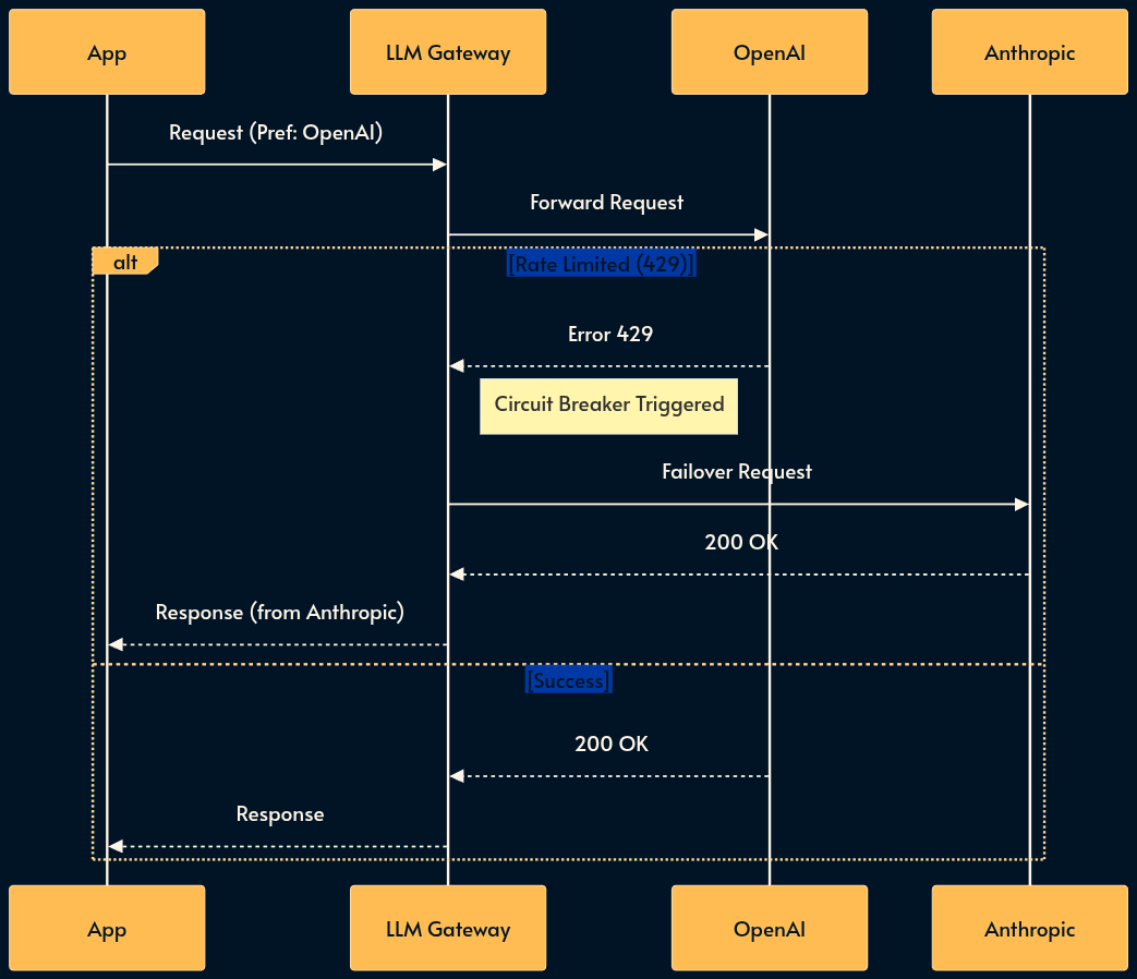 If OpenAI returns a 429 (Too Many Requests), the Gateway transparently retries with Azure OpenAI or fails over to Anthropic, ensuring high availability.