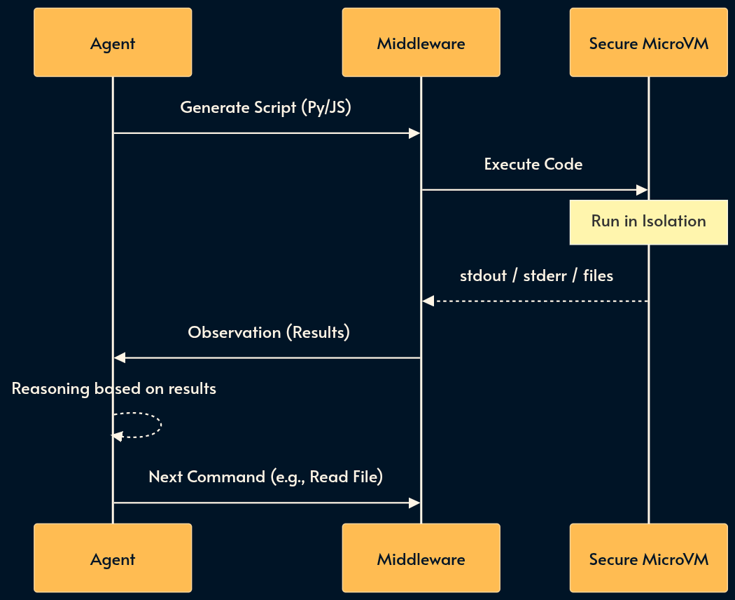 Sometimes rigid API tools aren’t enough. Sandboxing provides the agent with a persistent, isolated runtime (like a Docker container or Firecracker microVM) where it can run shell commands (python, bash, grep) and manipulate files.