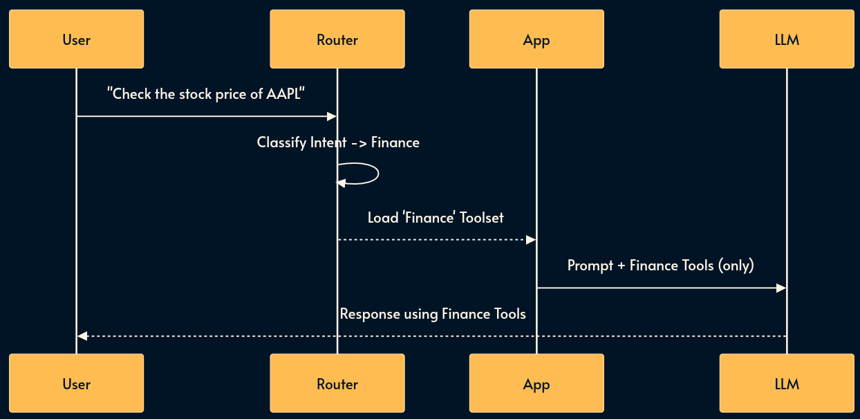 A “router” (often a smaller model or one with a dedicated prompt) classifies the user’s intent first. If the user asks about “Weather,” the system loads the Weather Tool definitions. If they ask about “Stock,” it loads the Finance Tool definitions.