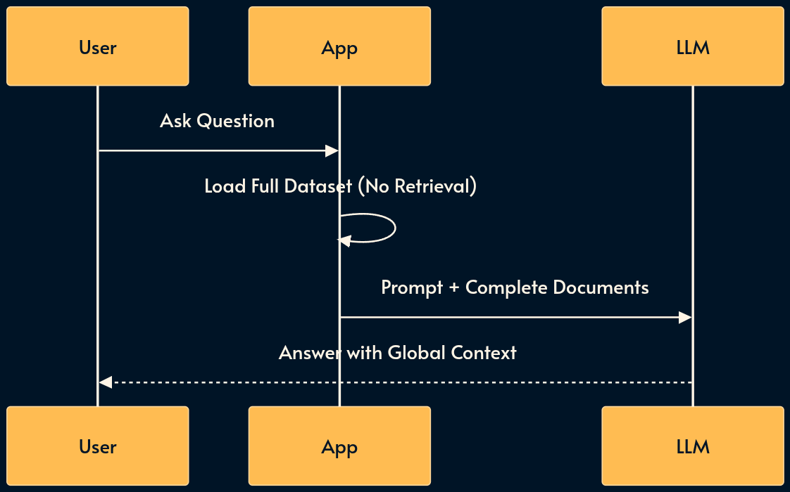 Pros: Zero retrieval latency; 100% recall (the model sees all data); simplified architecture (no vector DB or embedding calculation).