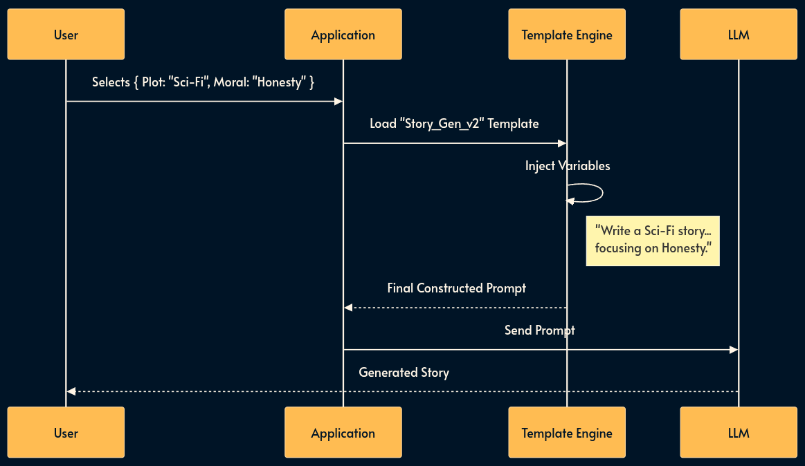 This pattern treats the Prompt as Source Code (version controlled, optimized by engineers) and the User Input as Variables (injected at runtime).