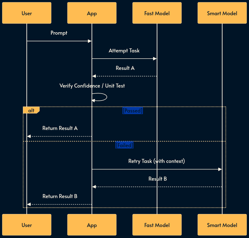 The system first attempts the task with a fast, cheap model. It then checks a confidence score or runs a unit test on the output. If the result fails, the system retries with a more expensive, smarter model.