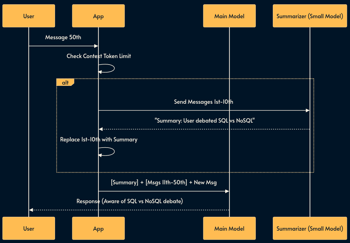 As a conversation grows, the context window fills up, increasing latency and cost. Simply truncating the history (FIFO) makes the model forget earlier discussions. Progressive Summarization recursively compresses the oldest messages into a concise “Summary Block” that is kept at the start of the prompt.