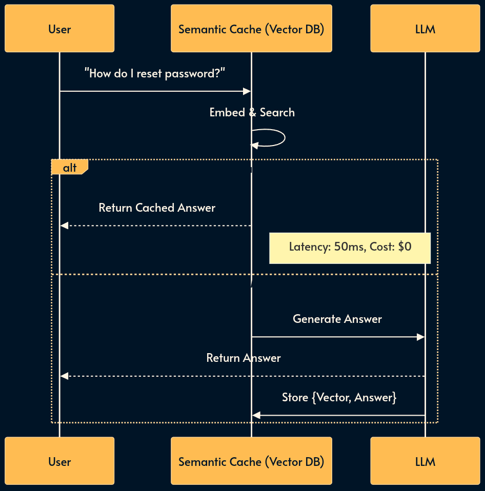 For high-volume applications (e.g., Customer Support), many users ask effectively the same question (”How do I reset my password?” vs. “Forgot password help”). Re-generating the answer every time is wasteful.
