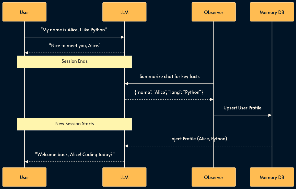 When a conversation ends, an observer agent summarizes key facts and writes them to a side-car database. These facts are injected into future sessions.