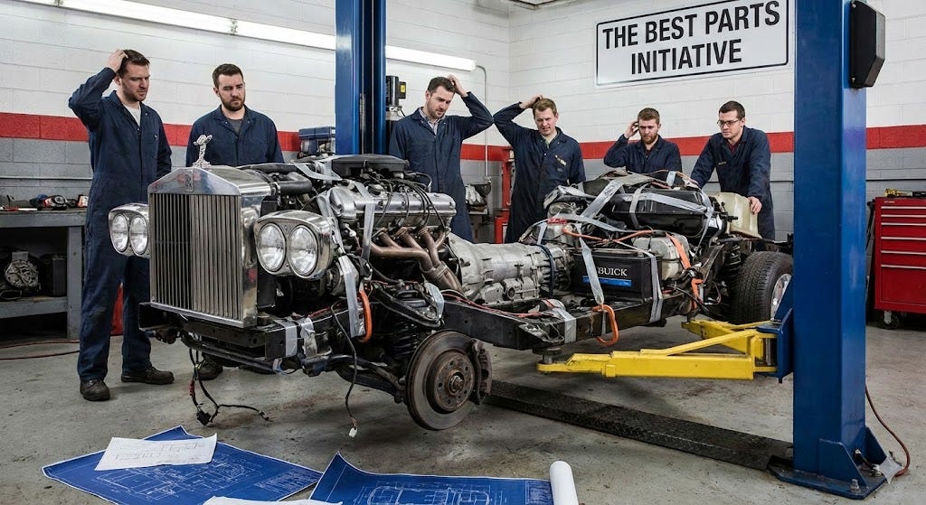 You don’t even get an automobile for the obvious reason the parts don’t fit. The performance of a system depends on how the parts fit not how they act taken separately.