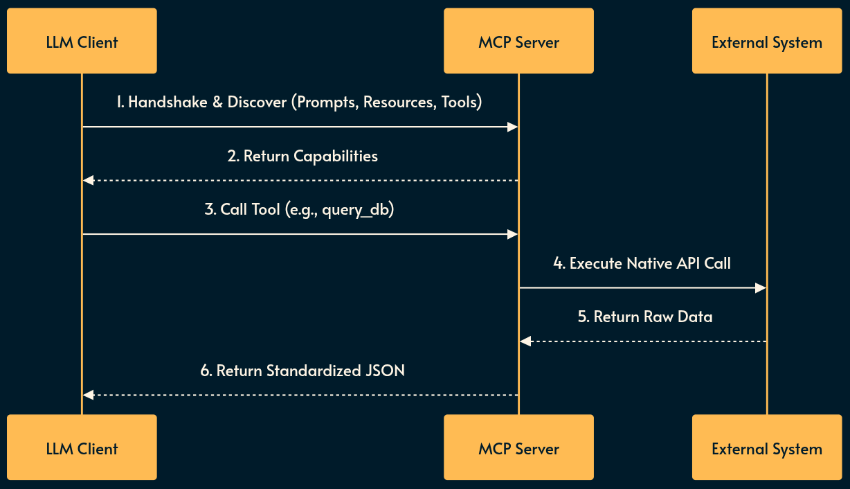 Discovery: The LLM client (not the raw LLM) connects to the MCP server and queries its available Prompts, Resources, and Tools via standardized JSON-RPC.