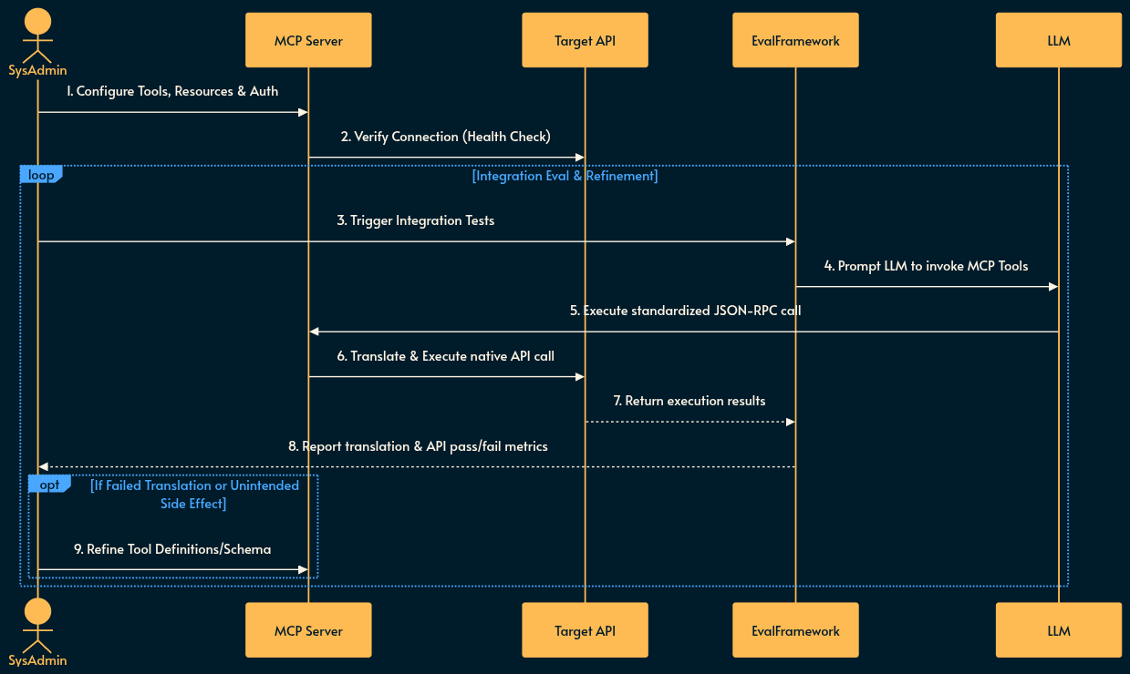 Integration Evaluation (Eval Loop): Automated test suites prompt an LLM to interact with the newly configured MCP server. The Eval framework validates that the LLM correctly discovers tools, forms valid JSON-RPC requests, and that the target API responds accurately without unintended state changes.
