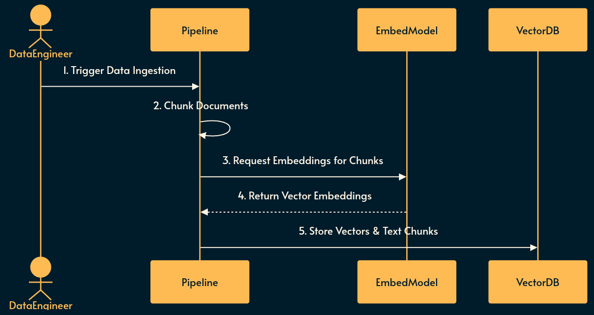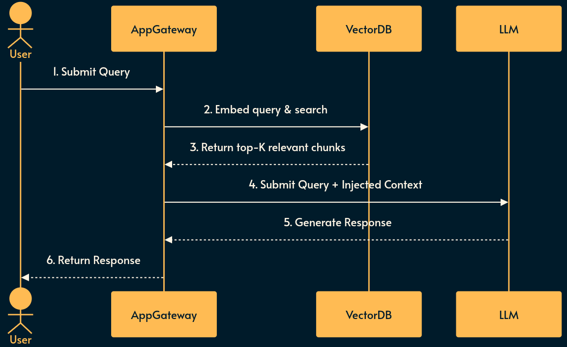 When a user interacts with the system, the pre-built vector database is queried to inject context dynamically.