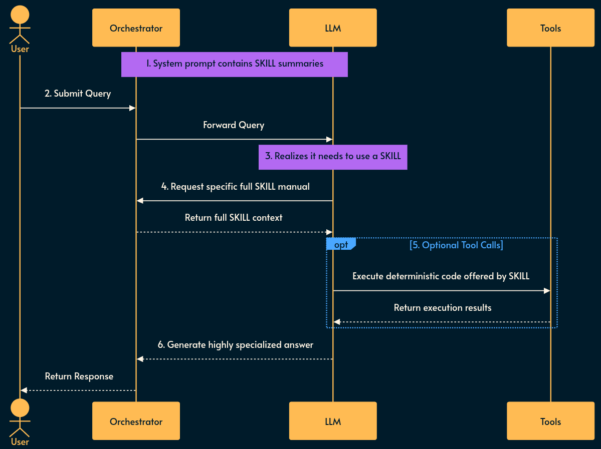 tool callsbased on the deterministic scripts offered by the skill (the orchestrator executes those calls).Execution: The LLM uses the results of the tool execution and the newly loaded context to formulate a highly specialized answer.