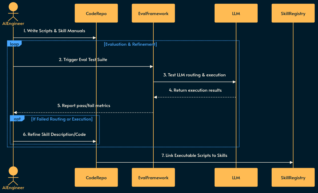 Evaluation (Eval Loop): The skill is tested against a “golden dataset” of test queries. The evaluation framework checks if the LLM correctly routes to the new skill and if the tool returns the expected output. Failures trigger refinements to the skill description or the underlying scripts.